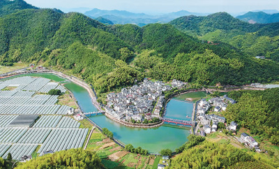浙江省淳安县下姜村,曾污水横流,村民靠"伐薪烧炭"维持生计。近年来,下姜村以"绿色发展"为指引,发展有机农业和旅游,持续收获好风景的"红利"。图为8月9日航拍的下姜村。